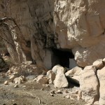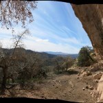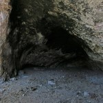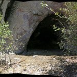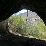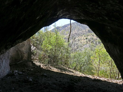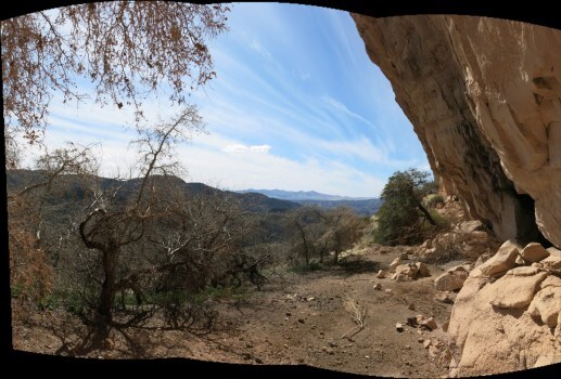 The side creek drains a hidden basin, which opened before me as I walked up the creek. The water soon receded underground and I was making my way up a dry wash, surrounded by the eerie white skeletons of trees burned in the 2011 wildfire and green thickets of oak and juniper that had filled in afterward. And ahead, the cliffs, over 200 feet tall, under which I expected to find the cave.