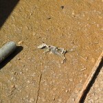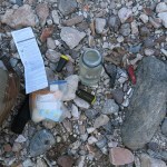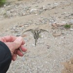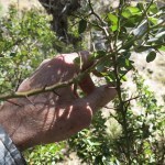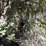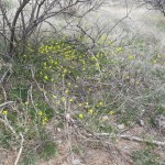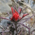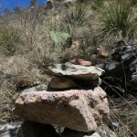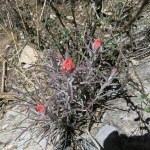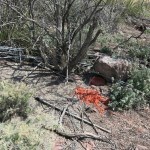 And after climbing up and down several more side drainages, I finally reached a deeper one where the trail really seemed to end. I explored a few options, but they all ended in catclaw thickets and piles of rocks. Suddenly, returning from one of these forays, I noticed something bright red in the distance, just above the trail I’d arrived on.