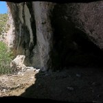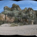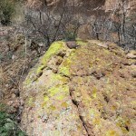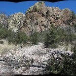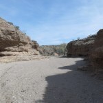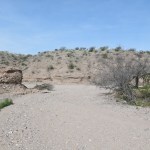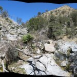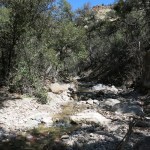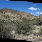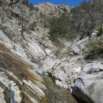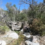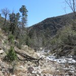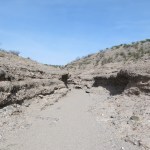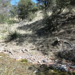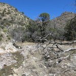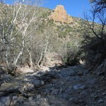 Still looking for lower-elevation trails, I wanted to try a new one over in Arizona this Sunday. But surprisingly, there was no room at the nearby inn. My second choice was the abandoned, flood-damaged, overgrown trail farther south that had defeated me in early February. I wasn’t really looking forward to the bushwhack, but it’s a pretty canyon and I was still hoping to reach the “Indian cave” and the prominent rock formation at the head of the canyon.