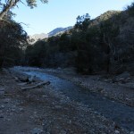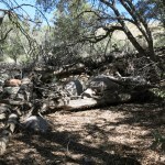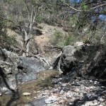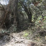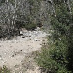 I’d expected my previous experience to result in an easier hike than before, but it actually felt even harder this time. Harder to distinguish remnants of the hiking trail from cattle trails, harder to relocate the trail after long scrambles up debris flows in the creek bed, harder to avoid the thorny shrubs on the banks, harder to get around log jams and thickets. I was already discouraged by the time I reached the first washed-out tributary, where I’d mistakenly looked for the cave last time.