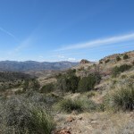 The trail then curved to my right onto a south slope which was mostly scrub, facing the distant mine. Then, surprisingly, the trail began to descend again, rounding several more shoulders, still overlooking the mine to the south, before I finally spotted what must be the dividing ridge holding the high saddle.