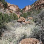 I unbuttoned my shirt, and as soon as I climbed out of the lush riparian zone onto the open, grassy slope, the temperature seemed to rise into the mid-80s. Surrounded by one of the most spectacular landscapes in the Southwest, with layered red and white cliffs and ramparts of towering spires, I stopped to stretch and tighten my boots. And a tiny older man in a drab “socialist worker” outfit – even shorter than me! – passed, running down the trail, carrying no gear, not even a water bottle.