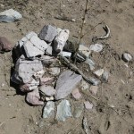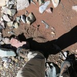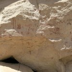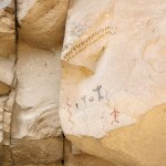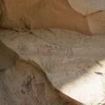 After the steep climb out of that canyon onto the next shoulder, as I started down into the next drainage, I was surprised by voices. A twenty-something girl, wearing a bundle of fine rings through her nasal septum, appeared out of the scrub, followed by three tall young guys. As we talked, I learned they were part of the group with the pickup trucks. They said their other friends had had to leave early. I started raving about the pictograph site, but the girl said she’d also been here in 2007. I found myself liking them more and more for their cheap, well-worn gear and outfits. They were taking ten-day camping trips instead of competing for high-paying desk jobs. But I remained mystified about what they’d been doing all day, and why they’d gotten such a late start.