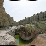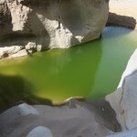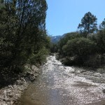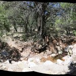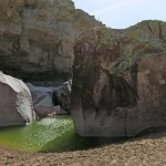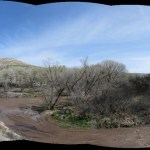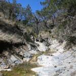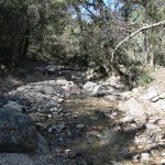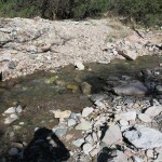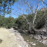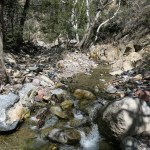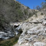 Whereas on my previous visit, I’d been alone in the valley of the remote “ghost town” that leads to the trail, this time I passed two vehicles and a jogger on the road in. And as I approached the sycamore-shaded creek crossing, the water level seemed surprisingly higher.
