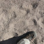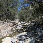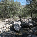 The road ends at the abandoned cabin, where two creeks come together, and my trail leads up the right-hand creek. But before the catastrophic floods, the road continued up the left-hand creek, and I suspect that road is still mostly intact above the canyon bottom. Heading up my trail, I immediately found the tracks of three recent hikers, who I assumed came down from above on the upper road, which can be reached from the opposite, west side of the mountain range. When I checked the map that night, I saw they could actually do a 12-mile loop from the paved road in the national monument on the west side, using a combination of trails and forest roads, with presumably the hardest part being the canyon trail I was taking.