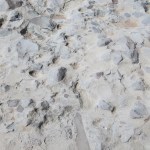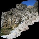Having started in the gully, which was getting deeper, with sheer walls, I had to do some really dangerous moves to follow the pipe out of it onto the 45 degree, catclaw-choked slope above. From there, it was a long, slow, dangerous scramble toward the foot of the cliff, which loomed at least 150′ tall. But I was now absolutely sure this was the place – it matched what I’d read in the old hikers’ trip report, and I could tell there was an overhang and a ledge up there under the cliff.