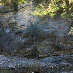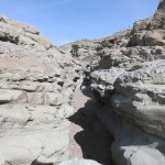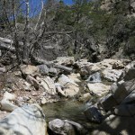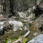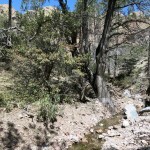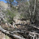Past that tributary, more bedrock is exposed in the canyon bottom, and if anything, the way gets even harder. But I still hadn’t come to the “narrows” which the trail guide mentions – based on second-hand historical sources, because nobody’s actually surveyed this trail since the 2011 wildfire.