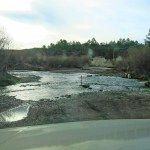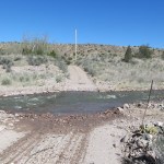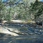 Because I’ve never had a serious high-clearance vehicle, I’ve never gotten really comfortable with stream crossings. This one had a submerged berm of rocks on the downstream side, but the water was too cloudy to tell how deep the crossing would be. I’ve crossed creeks up to about 8 inches deep, but I was afraid this might be a foot or more. If I got submerged above my door sills, the flood might exert enough force to wash me downstream into deeper water.