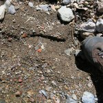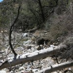 Passing the point where I’d turned back in February, I came to a massive log jam across the canyon, and climbing around it, reached a sandy ledge with an old fire ring. The previous hikers had tramped around here before continuing up canyon.