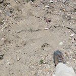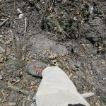 As before, I found no other human tracks as I scrambled up the first mile-and-a-third of catastrophically washed-out forest road, climbing up and down sheer drop-offs, crossing and re-crossing the rushing creek. But I did find recent tracks and scat from both cattle and what seemed to be wild burros or horses.