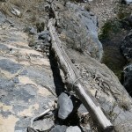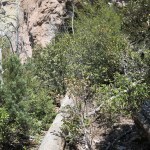 Finally I reached the “narrows”, where the canyon forms a “V” of stone, and the creek has cut a sinuous channel with many semi-circular hollows, deep pools, and small waterfalls. Here, I found a few decades-old trail improvements – including one walkway across a steep rock face, reinforced by half-rotted logs anchored by rebar sunk into holes drilled through the rock.