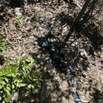 It turned out to be a jumble of plastic cord, and next to it was a loose pile of galvanized water pipe. Scouting around a little I also found some black plastic pipe.