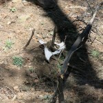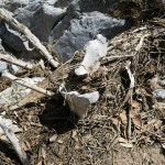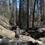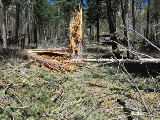 Spring flowers were spreading and checkerspot butterflies were out in force. But before I reached the branch trail there was an ominous sign – a mature ponderosa snapped off on the opposite bank, its yellow heartwood a chaos of splinters.