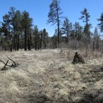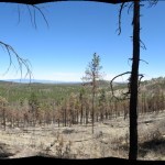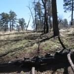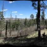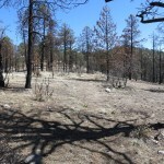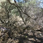 There were isolated remnants of a burn scattered around me. They looked recent but not fresh. This was on the edge of last year’s mega-wildfire. I watched carefully and couldn’t see an origin for the smoke, so I headed down the branch trail. After about a hundred yards I saw a meadow off to my right in the bottom of the drainage and made my way over there for a better view. Again, isolated charred logs and patches of ash-covered dirt, and another little cloud of smoke drifting through the trees. I touched a charred log – it was warm, but it was in the sun. I hadn’t smelled smoke yet at any point.