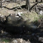 The Forest Service map I carried showed the corral nearly a mile west of here, in a fairly level spot. The 16-year-old memories of the Montana folks had understandably been a little rusty. But I was more curious about the water pipe, and the seeps under the cliff. This is normally a very dry area – the creeks and springs were running now after our wet winter, but would there really be a water source here, high on this slope, year-around? That would certainly explain the pictographs as well as the water pipe, and make this a precious site in more ways than one.
