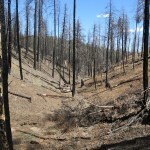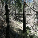 Most of the trees were less than 20 years old – many tall snags stood among them, but they hadn’t been killed by fire, so their deaths remained a mystery. The new trees and seedlings formed impenetrable thickets.
