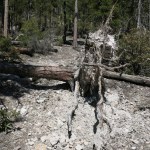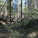 Two miles in, past the branch trail, I met the blowdown. And it just got worse, and worse, the farther I went. Living pines and firs, at least half of them between two and three feet in diameter, had either been uprooted or snapped off like twigs, and much of the ground was blanketed with foliage that had been blown off crowns of surviving trees.