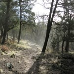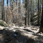 I took off running down the trail. But with 4 liters of water in my pack for warmer weather, I couldn’t really run on the rocky stretches without risking a broken ankle. My heart was pounding, even when not running. If the trail was on fire, I’d have to try to bushwhack around it. Or reverse and go the long way around, connecting with other trails to reach the road much farther north, fifteen miles or more. Meanwhile, my vehicle might be destroyed by the fire.
