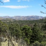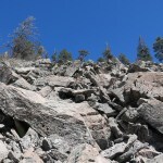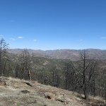 The first milestone shown on my map was called “Rocky Point”, which I was hoping would offer a vista across the landscape. But I hadn’t checked to see how far it was, and the trail just kept climbing, and climbing. This area had burned patchily, and I could sometimes see north between the trees, but that wasn’t very interesting. Finally I spotted a peak with talus slopes ahead – maybe that was it? But the trail turned, and climbed around its flank, where I finally got some longer views west across country I already knew well.