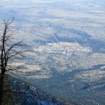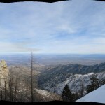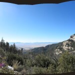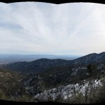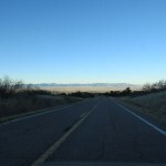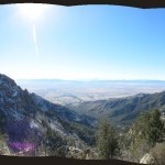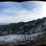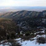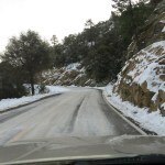 On the way up the road, a couple of little Japanese sedans raced past me – the road is closed for winter at the crest, but is plowed to the 7,500′ level where there’s a cluster of vacation cabins. At 6,000′ I encountered solid patches of ice in shady stretches of road, and despite switching into 4WD, found my extreme all-terrain tires had almost no traction on this road with hairpin curves and 700′ dropoffs with no shoulders and no guard rails.