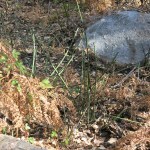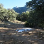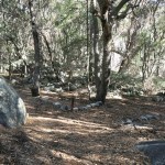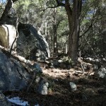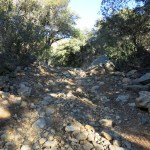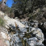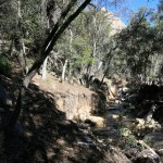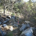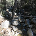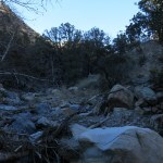 Continuing on the left branch, I reached the original end of the road, at the base of the massive boulder pile. There, two tributaries come together to form the lower creek, and that would be my moment of truth, since that’s where the old trail had been washed out.