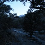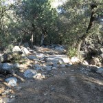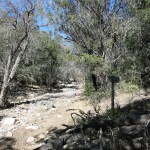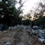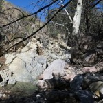 Since the lower part of the trail follows the old road, it’s always interesting to see how drivable that road is, and how far people have made it up recently. With floods, this canyon has regularly been conveying the top of the mountain down from time immemorial, and the top of the mountain surrounds you all the way up, in the form of white boulders that fill the creekbed and have been bulldozed into rows beside the road.