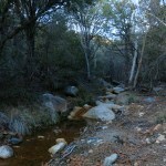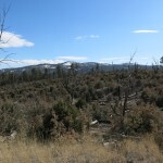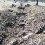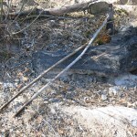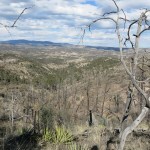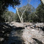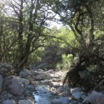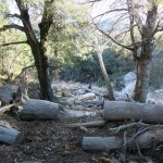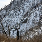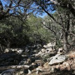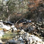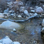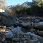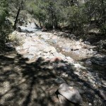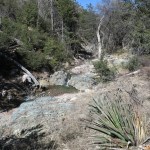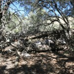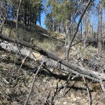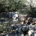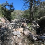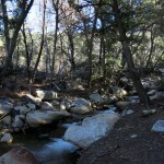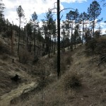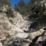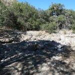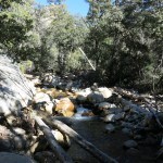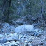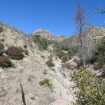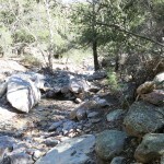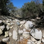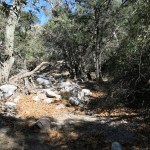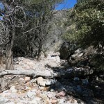 On its way upstream, the forest road had apparently crossed the creek several times, actually using the creek bed itself for lengthy stretches. But after the 2011 fire, major sections of that road had completely disappeared, and what was left was debris – boulders, logs, and the creek. To avoid triggering severe pain and paralyzing myself, I had to somehow maintain posture while picking my way over the obstacles, and it was a continual ordeal, punctuated occasionally by cries of pain. At least I was alone – no one could hear my cries.