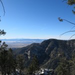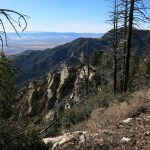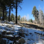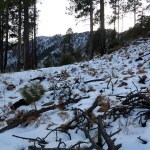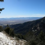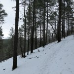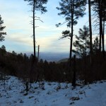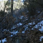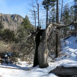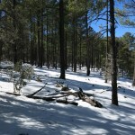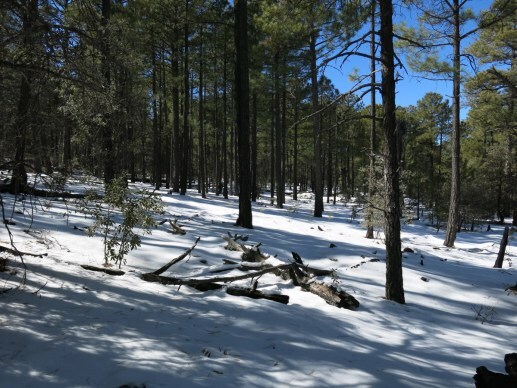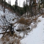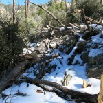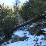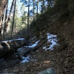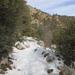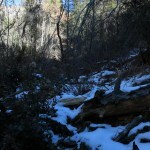 One consolation I had on the way up was the assumption that the descent would be easier and go much faster. This turned out to be true – I could go much farther without stopping to catch my breath – but I had to be careful too. Like most trails in the Southwest, this was lined with rocks, and every dozen yards or so I stepped on a rock hidden beneath the snow. The sharp ones threw me off balance, and when I stepped on a tilted one, one foot immediately slid out from under me.