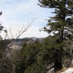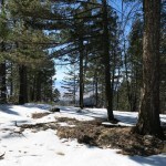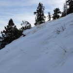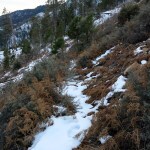 Now I was in deep shade, where snow had collected up to 8 inches. But the trail to the crest consists of nearly 40 switchbacks climbing 2,200 vertical feet, and the slope they climb faces west. I figured every other switchback would have enough southern exposure to melt the snow, and I was right. All the way to the top, I only had limited patches of snow to deal with, up to a hundred yards at a time.