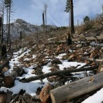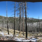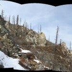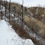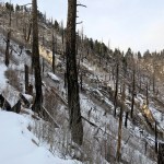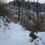 This area had been badly burned, and the ground consisted mostly of small boulders. The trail was a shallow trough that collected deeper snow than the surrounding ground, but the surrounding ground was too dense with obstacles to make it worthwhile to go off trail to avoid the snow. So I kept trudging, the snow getting gradually deeper the higher I climbed.