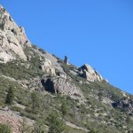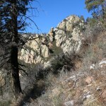 According to maps, the trail begins on a forest road and continues up a canyon for a few miles to a short fork that leads to a large rockshelter called “Indian Cave”, which would definitely interest me. From the fork, the main trail climbs to a saddle, from which you can continue to a landmark rock formation I’ve seen many times from the crest of the range. That was my ideal destination, assuming I could even find enough trail to follow.