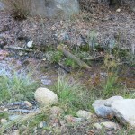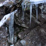 Fortunately no patches of snow yet, and the dirt was mostly still frozen, but the hike had gotten much slower. It was warm in the sun, so I took off my sweater, but wind was rising out of the west, and banks of clouds soon drifted over, so I had to pull the sweater back on, only to overheat fifteen minutes later. Eventually the trail dropped into the canyon of yet another stream – I hadn’t anticipated this either – but this one was smaller and easier to cross.