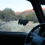 Returning those 5 miles, with many stops, took 3 hours. But at sunset, what should I find at my vehicle, but a big black bull?