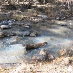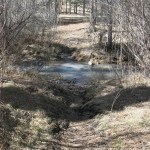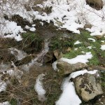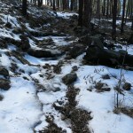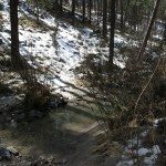 The second creek drains a much bigger watershed, and was running at twice the volume of the first creek. I scouted upstream, where it gets rockier, but couldn’t find anyplace to cross without swamping at least one boot in ice-cold water.