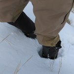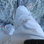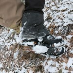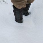 This hike averages about 7,200′ elevation, and I was hoping the snow wouldn’t be too deep. But three-and-a-half miles in, the trail crosses to the west side of the ridge, where the patches of snow were up to a foot deep. The man from yesterday had turned back, and I was now alone with the deep holes punched by the horse. And the snow was sometimes soft enough to sink through, so now I was lurching even more. But there were still a few dry stretches of trail, and I stopped in one to put on my gaiters.