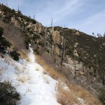 More than halfway up to the crest, the trail crosses out of the first canyon, makes another half dozen switchbacks, and finally begins a long traverse to the saddle at the crest. Up there the geology changes and you encounter spectacular rock formations, and get your first view of the peak with the towers. But virtually all that traverse is shaded north slope where the snow was now at least a foot deep. I’d always wondered what it would be like to walk a long distance in snow that deep. If I’d known what it was like, I wouldn’t have tried it!