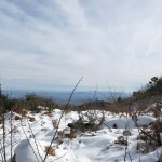 In short order, that took me to the fairly level top of the ridge, partly forested, holding deeper snow, where I had glimpses of the high peaks of the range, arrayed to north and east.