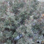 I began to find sporadic, minimal cairns, half-buried in grass along the “cattle trail”, proving there really was a hiking trail here once, long ago. And I reached a major side canyon on the right. According to the map I’d brought, this would have to be the Indian Cave canyon, so I started up it, holding myself stiff at the waist to avoid triggering my lower back. It was really steep and split into two branches. I climbed the ridge between them but hit an impassable wall of shrubs. Then I climbed back down into the right fork, but was soon stopped by a wall of flood debris. I figured I’d gone too far anyway – this probably wasn’t the cave drainage.