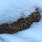 Finally I reached the frigid canyon bottom and the creek crossing, which was even more flooded from the day’s snowmelt. To prepare for the possibility of slipping and falling in the water, I packed my warmest clothes and camera in a plastic bag inside my pack. I pulled on my lined Goretex ski gloves and gripped two stout sticks, and crossed the flooded rock dam with no problems.