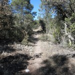 So I went back to the junction and headed west. This was immediately a better trail – narrow, traveled only by wildlife. The map showed a shortcut that bypassed some of the first trail along the ascending ridgetop, and I found its outlet and decided to try it on my return.