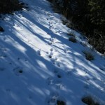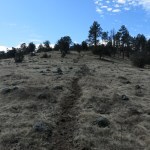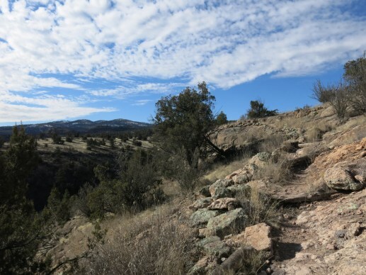 The next stretch traverses the eastern rim of the long ridge, winding back and forth, in and out of shadowed slopes that held up to 6 inches of snow. The snow was trodden and pitted by a chaotic mix of old and new tracks that I eventually sorted out as a man who had been here yesterday, and a horse and dog that had been here last weekend. Even where untracked, the snow had a soft inch on top of a harder base, but the tracks made for an uneven surface which turned my gait into a sort of lurch.