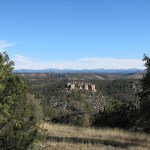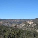 This rim trail wasn’t intended as a rim trail – these are not sheer-walled canyons cut through flat plateaus like the ones in northern Arizona and Utah. This trail simply traverses upper slopes on its way to junctions with other trails, farther west. Gullies in those slopes take it in and out and up and down along the way, always through forest, so I never got a satisfying view of the canyon – only tantalizing glimpses through the trees, of white pinnacles and strangely fluted cliffs. There were some nice red capstone bluffs above me, and some cool white ones across the canyon in the distance, but no trails go there.