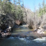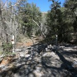 Continuing up the ridge past the first fork, the trail rises from the open pinyon-juniper-oak woodland into the ponderosa pine zone, then descends 300 feet into the canyon of a creek. I’d overlooked this on the map, and was surprised to find one of the biggest creeks in the range, in full snowmelt flood. It took me fifteen minutes to find a place downstream where I could cross on a log and a series of big rocks.