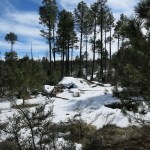 I was hoping to go at least 6 miles, and as before, was relieved when I finally reached the ponderosa forest above 7,400′. This rolling plateau of broad meadows and exposed bedrock continues to the edge of a little valley, and past that, begins the climb towards the head of the next canyon. I figured I’d passed the 6-mile mark and didn’t want to have to climb back out of that depression in deep snow, so I stopped and enjoyed the snowy forest for a while before turning back.