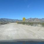 I’d driven the access road twice before – it’s a very rocky high-clearance-only path roughly bulldozed up the alluvial fan behind the state prison, to the creek crossing, about a mile below the mouth of the canyon. On both previous visits, the creek crossing had been flooded to over a foot deep and blocked by 18″ tall boulders, so I was assuming I’d again have to park at the crossing, find a log to cross the raging creek on, and walk the rest of the way up the old road on the opposite side.