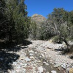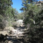 On the way down, it turned out to be easier to find cairns and sections of the old trail. Like most canyon trails it kept crossing and recrossing the creek. My back pain was increasing and I took a third pill. I was looking forward to dinner and a beer at the cafe, and a bed for the night so I wouldn’t have to drive all the way home.