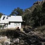 I painfully found my way up this devastated canyon bottom for almost a mile and a half, finally reaching the cabin on the left. It was preceded by another big washout and a collapsed gate adorned with metal bird symbols, so I assumed the builders had been birders like most inhabitants of this range. And now they would never use their cabin without either a difficult hike or fantastically expensive and unsustainable road work. Building a cabin on a creekbed road in a narrow canyon just shows that birders are no more ecologically aware than the rest of us. I once had similarly clueless ambitions for my place in the desert.