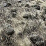 I had to go off trail to avoid the mud, but off the trail, I was lurching and stumbling on the volcanic cobbles, many of which were hidden under tussocks of dried grass. There was enough forest around me that I had no view out and couldn’t see the peak I was aiming for, so I had no idea how much farther it was. This was turning into a truly miserable hike, and eventually I gave up.