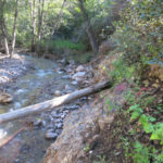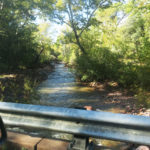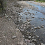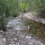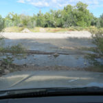 Approaching the creek, the dirt access road enters a shady sycamore forest, emerging abruptly into the light to descend a steep bank into the creekbed. It’s a good thing I was driving slowly, because the road ended suddenly in a four-foot drop-off, and the creek, which had previously been about 15 feet wide, was now more than 60 feet wide. A huge amount of water had come down, recutting the whole broad channel. I assumed the ranch on the other side of the creek had another access road, because they weren’t going to be using this one for a while.