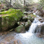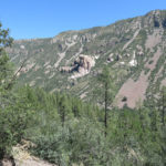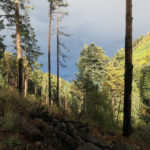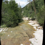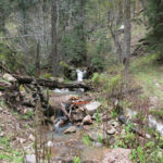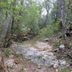 Like most of these west-side trails, it traverses down into the canyon first, then continues upstream a few miles to the base of switchbacks that then lead to the crest. In this case, it’s 3/4 of a mile from trailhead to first creek crossing, and that’s where I had my next surprise. The canyon bottom had been scoured by a very recent flash flood – probably in the last couple of weeks – that had brought down tons of debris – rocks and shattered logs. The creek was roaring along but was precariously crossable on submerged rocks thanks to my waterproof boots.